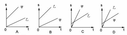 4、(6分)甲、乙两物体朝同一方向做匀速直线运动,已知甲的速度大于乙的速度,t=0时,乙在甲之前一定距离处,则两个物体运动的位移图象应是:( )