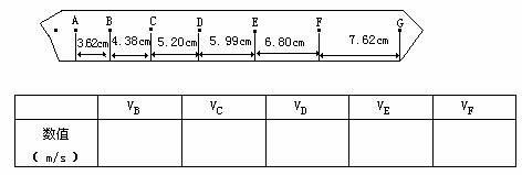 (1)试根据纸带上各个计数点间的距离,每个0.10s测一次速度,计算出打下B、C、D、E、F五个点时小车的瞬时速度,并将各个速度值填入下表要求保留3位有效数字