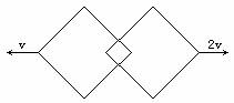 2、如图所示,两个相同的正方形铁丝框,其对角线在同一条直线上,并沿对角线分别以v和2v向两边运动,则两框交点的运动速度为: