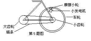 5.如图所示,一种向自行车车灯供电的小发电机的上端有一半径R0的摩擦小轮,小轮与自行车车轮的边缘接触。当车轮转动时,因摩擦而带动小轮转动,从而为发电机提供动力。自行车车轮的半径R1,小齿轮的半径R2,大齿轮的半径R3。则大齿轮的转速n1和摩擦小轮的转速n2之比为。(假定摩擦小轮与自行车轮之间无相对滑动)
