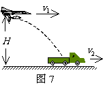 18.(8分)如图7所示,飞机离地面高H=500m,水平飞行速度为v1=100m/s,追击一辆速度v2=20m/s同向行驶的汽车,欲使从飞机上投下的炸弹击中汽车,飞机应在距汽车水平距离多远处投弹?(g=10m/s2)