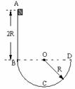 如图所示,有一光滑轨道ABCD,其中AB沿竖直方向,BCD为竖直面内的半圆轨道,圆心在O,半径为R,B、O、D在同一水平面上。一个质量为m的小物块,以一初速度从A点向下沿轨道运动,不计空气阻力,若物块通过轨道的最低点C时的速度为Vc=3