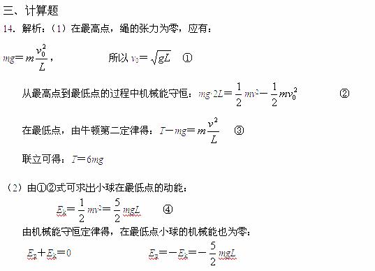 14.长为L的轻绳一端固定,另一端系住一个质量为m的小球,使小球在竖直平面内做圆周运动.当小球运动到圆周的最高点时,绳的张力恰为零。设在圆周的最高点小球的机械能为零.求: