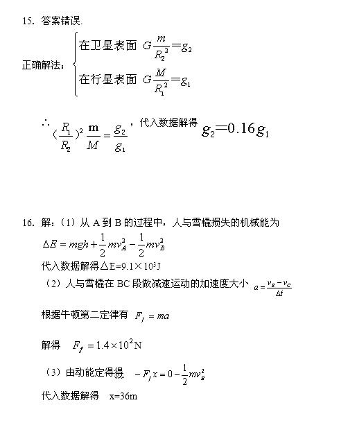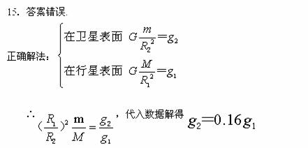 15.一卫星绕某行星做匀速圆周运动,已知行星表面的重力加速度为g1,行星的质量M与卫星的质量m之比为M/m=81,行星的半径R1与卫星的半径R2之比为R1/R2=3.6,行星与卫星之间的距离r与行星的半径R1之比为r/R1=60.设卫星表面的重力加速度为g2,则在卫星表面有GMm/r2=mg2 。经过计算得出:卫星表面的重力加速度为行星表面的重力加速度的1/3600.上述结果是否正确?若正确,列式证明;若错误,求出正确结果。