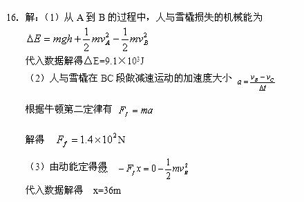 16.如图所示,某人乘雪橇从雪坡经A点滑到B点,接着沿水平路面滑至C点停止。人与雪橇的总质量为70kg。下表中记录了沿坡滑下过程中的有关数据,开始时人与雪橇距水平路面的高度h=20m,取g=10m/s2,请根据下表中的数据解决下列问题: