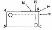 有一项趣味竞赛:从光滑水平桌面的角A向角B发射一只乒乓球,要求参赛者在角B处用细管吹气,将乒乓球吹进角C处的圆圈中。赵、钱、孙、李四位参赛者的吹气方向如图中各自的箭头所示,其中,有可能成功的参赛者是( )