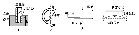 电容器的电容跟两极板间距离、正对面积以及极板间的电介质这几个因素有关,如果某一物理量(如位移、角度、压力等)的变化能引起上述某个因素的变化,从而引起电容变化,那么,通过测定电容器的电容就可以确定上述物理量的变化,作为这种用途的电容器称为电容式传感器。如图所示,甲、乙、丙、丁是四种常见的电容式传感器,下列分析正确的是