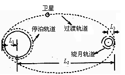 (9分)我国发射的“嫦娥一号”卫星发射后首先进入绕地球运行的“停泊轨道”,通过加速再进入椭圆“过渡轨道”,该轨道离地心最近距离为L1,最远距离为L2,卫星快要到达月球时,依靠火箭的反向助推器减速,被月球引力“俘获”后,成为环月球卫星,最终在离月心距离L3的“绕月轨道”上以线速度V2飞行.已知地球半径为R,地球表面重力加速度为g,月球表面的重力加速度为g/6,求: