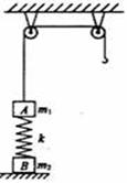 如图,质量为m1的物体A 经一轻质弹簧与下方地面上的质量为m2的物体B 相连,弹簧的劲度系数为k , A .B 都处于静止状态。一条不可伸长的轻绳绕过轻滑轮,一端连物体A ,另一端连一轻挂钩。开始时各段绳都处于伸直状态,A 上方的一段绳沿竖直方向。现在挂钩上挂一质量为m3的物体C 并从静止状态释放,已知它恰好能使B 离开地面但不继续上升。若将C 换成另一个质量为(m1+ m3)的物体D ,仍从上述初始位置由静止状态释放,则这次B 刚离地时D的速度的大小是多少?已知重力加速度为g.