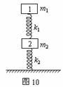 如图10所示,劲度系数为k1的轻质弹簧两端分别与质量为m1,m2的物块1、2拴接,劲度系数为k2的轻质弹簧上端与物块2拴接,下端压在桌面上(不拴接),整个系统处于平衡状态。现施力将物块1缓慢地竖直上提,直到下面那个弹簧的下端刚脱离桌面.在此过程中,物块2的重力势能增加了____ ____,物块1的重力势能增加了______ _。