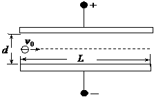 (18分)如图,带电平行板长为L,极板间距离为d,将电子(质量为m、电量为-e)在两板中央以速度v0垂直电场方向射入,飞出电场时侧位移为 d,不计重力,求: