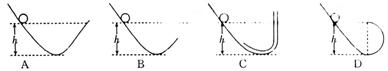 ;B图中的轨道与A图中轨道相比只是短了一些,且斜面高度小于h;C图中的轨道是一个内径略大于小球直径的管道,其上部为直管,下部为圆弧形,与斜面相连,管的高度大于h;D图中的轨道是个半圆形轨道,其直径等于h。如果不计任何摩擦阻力和拐弯处的能量损失,小球进入右侧轨道后能到达h高度的是( )