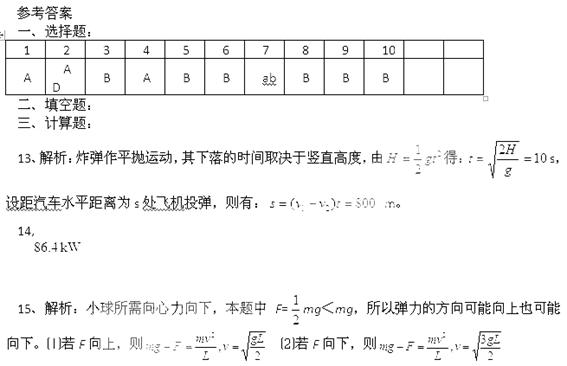 13.(8分)飞机离地面高度为H=500m,水平飞行速度为v1=100m/s,追击一辆速度为v2=20 m/s同向行驶的汽车,欲使炸弹击中汽车,飞机应在距离汽车的水平距离多远处投弹?(g=10m/s2)