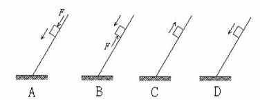 9下列四个选项的图中,木块均在固定的斜面上运动,其中图A、B、C中的斜面是光滑的,图D中的斜面是粗糙的,图A、B中的F为木块所受的外力,方向如图中箭头所示,图A、B、D中的木块向下运动,图C中的木块向上运动,在这四个图所示的运动过程中机械能守恒的是( )
