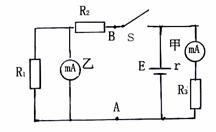 电阻为3Ω,S闭合时,甲、乙两个毫安表的示数之比为1:2,求R1、R2的阻值各为多