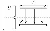 如图所示,一质量为m,电量为q的带电粒子从静止出发被电压为U的电场加速,然后垂直进入另一个电场强度为E的匀强偏转电场,已知偏转电极长L.求电子离开偏转电场时的速度及其与起始速度方向之间的夹角?