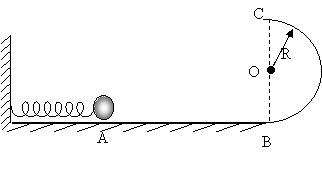 15. (16分)如图所示,半径为R的竖直光滑半圆形轨道BC与光滑水平地面AB相切于B点,弹簧左端固定在竖直墙壁上,用一质量为m的小球紧靠弹簧并向左压缩弹簧,已知弹簧在弹性限度内。现由静止开始释放小球,小球恰好能沿轨道通过半圆形轨道的最高点C。求: