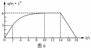 13. (18分)某兴趣小组对一辆自制遥控小车的性能进行研究. 他们让这辆小车在水平的直轨道上由静止开始运动,并将小车运动的全过程记录下来,通过处理转化为v-t图象,如图6所示(除2s-10s时间段图象为曲线外,其余时间段图象均为直线). 已知在小车运动的过程中,2s-14s时间段内小车的功率保持不变,在14s末停止遥控而让小车自由滑行,小车的质量为1.0kg,可认为在整个运动过程中小车所受到的阻力大小不变. 求: