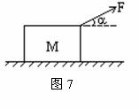 (10分)如图7所示,位于水平地面上的质量为M的小木块,在大小为F,方向与水平方向成角的拉力作用下沿地面做匀速直线运动。求: