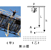 (9分)蹦极是一项既惊险又刺激的运动,深受年轻人的喜爱。如图所示,原长L=16m的橡皮绳一端固定在塔架的P点,另一端系在蹦极者的腰部。蹦极者从P点静止跳下,到达A处时绳刚好伸直,继续下降到最低点B处,