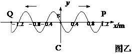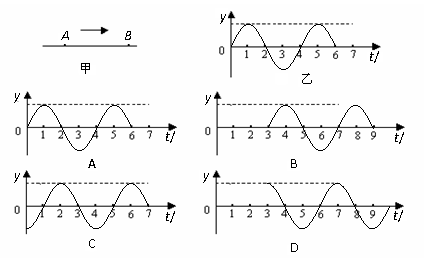 一列简谐横波以1m/s的速度沿绳子由A向B传播,质点A、B间的水平距离x=3m,如图甲所示。若t=0时,质点A刚从平衡位置开始向上振动,其振动图象如图乙所示。则B点的振动图象为下面四个图中的( )