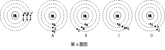 5.三颗人造地球卫星A、B、C在同一平面内沿不同的轨道绕地球做匀速圆周运动(轨道半径分别为rA、rB、rC),且绕行方向相同,已知rA<rB<rC 。若在某一时刻,它们正好运行到同一条直线上,如图所示。那么再经过卫星A的四分之一周期时,卫星A、B、C的位置可能是