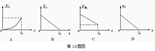 13.一物体沿固定斜面由静止开始从顶端向下滑动,斜面的粗糙程度处处相同,斜面长为l0。Ek、Ep 、E机和Wf分别表示该物体下滑距离x时的动能、重力势能、机械能和物体此过程中克服摩擦力所做的功。(以斜面底部作为重力势能的零势能面),则下列图象能正确反映它们之间关系的是