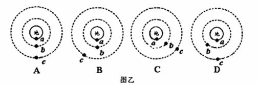10、如图,a是静止在地球赤道上的物体,b、c是两颗人造地球卫星,其中c是地球的同步卫星,a、b、c在同一平面内沿不同的轨道绕地心做匀速圆周运动,三者绕行方向相同(为图示顺时针方向),已知Rb<Rc。若在某一时刻,它们正好运行到同一条直线上,如图甲所示。那么再经过6小时,物体a、卫星b、c的位置可能是图乙中的 ( )