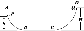 20.(10分)滑板运动是一项惊险刺激的运动,深受青少年的喜爱.如图是滑板运动的轨道,AB和CD是一段圆弧形轨道,BC是一段长7m的水平轨道.一运动员从AB轨道上P点以6m/s的速度下滑,经BC轨道后冲上CD轨道,到Q点时速度减为零.已知运动员的质量50kg,h=1.4m,H=1.8m,不计圆弧轨道上的摩擦.(g=10m/s2)求:
