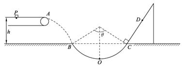 17.质量为m=1 kg的小物块轻轻放在水平匀速运动的传送带上的P点,随传送带运动到A点后水平抛出,小物块恰好无碰撞的沿圆弧切线从B点进入竖直光滑圆弧轨道下滑.B、C为圆弧的两端点,其连线水平.已知圆弧半径R=1.0 m,圆弧对应圆心角为θ=106°,轨道最低点为O,A点距水平面的高度h=0.8 m.小物块离开C点后恰能无碰撞的沿固定斜面向上运动,0.8 s后经过D点,物块与斜面间的滑动摩擦因数为μ=0.33(g=10 m/s2,sin37°=0.6,cos37°=0.8)试求: K^S*5U.C