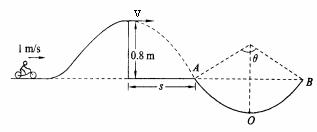 17. (15分)如图所示,摩托车做腾跃特技表演,以1.0m/s的初速度沿曲面冲上高0.8m、顶部水平的高台,若摩托车冲上高台的过程中始终以额定功率1.8kW行驶,经过1.2s到达顶部平台,接着离开平台,落至地面时,恰能无碰撞地沿圆弧切线从A点切入光滑竖直圆弧轨道,并沿轨道下滑。A、B为圆弧两端点,其连线水平。已知圆弧半径为R=1.0m,人和车的总质量为180kg,特技表演的全过程中,阻力做功忽略不计。(计算中取g=10m/s2,sin53°=0.8,cos53°=0.6)。求: K^S*5U.C#O