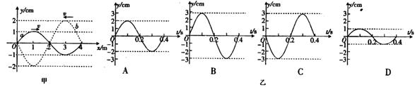 9. 简谐横波a沿x轴正方向传播,简谐横波b沿x轴负方向传播,波速都是10m/s,振动方向都平行于y轴,t = 0时刻,这两列波的波形如图甲所示.乙图是平衡位置在x = 2 m处的质点从t = 0开始在一个周期内的振动图象,其中正确的是( )