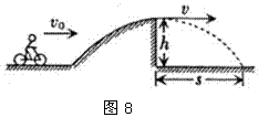 18.(11分)如图8所示,摩托车做腾跃特技表演,以初速度v0冲上高为h、顶部水平的高台,然后从高台水平飞出.若摩托车始终以额定功率P行驶,经时间t从坡底到达坡顶.已知人和车的总质量为m,各种阻力的影响可忽略不计。求人和车飞出的水平距离s.