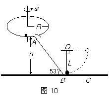 20.(17分)如图10所示,一水平圆盘半径为R=0.2 m,绕过圆心的竖直轴转动,圆盘边缘有一质量m=1.0 kg的小滑块。当圆盘转动的角速度达到某一数值时,滑块从圆盘边缘滑落,经光滑的过渡圆管进入轨道ABC。已知AB段斜面倾角为53°,BC段水平,滑块与圆盘及轨道ABC间的动摩擦因数均为μ=0.5,A点离B点所在水平面的高度h=1.2 m。滑块沿轨道AB下滑至B点、速度刚好沿水平方向时与静止悬挂在此处的小球发生正碰,碰撞后小球刚好能摆到与悬点O同一高度处,而滑块沿水平轨道BC继续滑动到C点停下。已知小球质量m0=0.50 kg,悬绳长L=0.80 m,滑块和小球均视为质点,不计滑块在过渡圆管处和B点的机械能损失,最大静摩擦力近似等于滑动摩擦力,取g=10 m/s2,sin53°=0.8,cos53°=0.6。