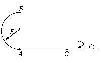 (12分)如图所示,半径R=0.4m的光滑半圆环轨道处于竖直平面内,半圆环与粗糙的水平地面相切于圆环的端点A.一质量m=0.1kg的小球,以初速度v0=8m/s在水平地面上向左作加速度a=4m/s2的匀减速直线运动,运动4m后,冲上竖直半圆环,经过最高点B最后小球落在C点。取重力加速度g=10m/s2。求: