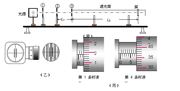 (2)分划板的中心刻线分别对准第1条和第4条亮纹的中心时,手轮上的读数如图(丙)所示,则对准第1条时读数x1=_______mm、对准第4条时读数x2=_______mm