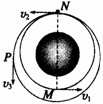我国发射“神舟”六号飞船时,先将飞船发射到一个椭圆轨道上,其近地点M距地面200 km,远地点N距地面340 km,进入该轨道正常运行时,通过M、N点的速率分别为v1和v2,如图所示.当飞船通过N点时,地面指挥部发出指令,点燃飞船上的发动机,使飞船在短时间内加速后进人离地面340 km的圆形轨道,开始绕地球做匀速圆周运动,这时飞船的速率为v3.比较飞船在M、N、P三点正常运行时(不包括点火加速阶段),则速率大小和加速度大小,下列结论正确的是 ( )