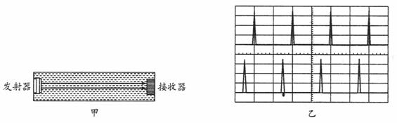 (7分)有一种示波器可以同时显示两列波形。对于这两列波,显示民间上横向每格代表的时间间隔相同。利用此种示波器可以测量液体中的声速,实验装置的一部分如图甲所示:管内盛满液体,音频信号发生器所产生的脉冲信号由置于液体内的发射器发出,被接收器所接收。图乙为示波器的显示屏,屏上所显示的上、下两列波形分别为发射信号与接收信号。若已知发射的脉冲信号频率为