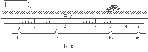 如图所示,图A是在高速公路上用超声波测速仪测量车速的示意图,测速仪发出并接收超声波脉冲信号,根据发射和接收到的信号间的时间差,测出被测物体的速度。图B中P1、P2是测速仪发出的超声波信号,n1、n2分别是P1、P2由汽车反射回来的信号,设测速仪匀速扫描,P1、P2之间的时间间隔∆t=1.0s,超身波在空气中传播的速度是v=340m/s,若汽车是匀速形驶的,则根据图B可知,汽车在接收到P1、P2两个信号之间的时间内前进的距离是多少米?汽车的速度是多少?(此题计算结果保留两位有效数字)