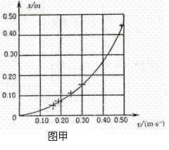 (1)一同学根据表中数据,作出x-v图象如图甲所示.观察该图象,该同学作出如下推理:根据x-v图象大致是一条抛物线,可以猜想,x可能与v2成正比.请在图乙所示坐标纸上选择适当的坐标轴作出图线验证该同学的猜想.