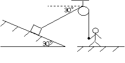 如图所示,人重300N,物体重200N,斜面粗糙,当人用100N的力竖直向下拉绳子时,物体仍处于静止状态,求①人对地面的压力;②物体对斜面的压力;③物体对斜面的摩擦力。