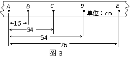 在《研究匀变速直线运动》的实验中,计时器使用的是50 Hz的交变电流。随着小车的运动,计时器在纸带上打下一系列的点,取A、B、C、D、E五个计数点,在两个相邻的计数点中还有4个点没有画出,测得的距离如图3所示(单位为cm),则小车的加速度为___________ m/s2。