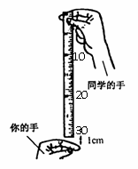 (4分)如图所示,请你的同学用手指拿着一把长30 cm的直尺,你的手离开直尺下端1 cm处,当他松开直尺,你见到直尺向下作匀加速运动时,立即用手抓着直尺,记录抓住处的数据,重复以上步骤多次。直尺下落的加速度为9.8 m/s2。现有A、B、C三位同学相互测定神经系统的反应时间,得到以下数据(单位:cm,注:计算时保留两位小数)。
