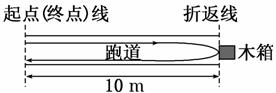 (10分)“10米折返跑”的成绩反映了人体的灵敏素质.测定时,在平直跑道上,受试者以站立 式起跑姿 势站在起点(终点)线前, 听到起跑的口令后,全力跑向正前方10米处的折返线,测试员同时开始计时.受试者到达折返线处,用手触摸折返线处的物体(如木箱)后,再转身跑向起点(终点)线,当胸部到达起点(终点)线的垂直面时,测试员停止计时,所用时间即为“10米折返跑”的成绩,如下图所示.设受试者起跑的加速度为4 m/s2,运动过程中的最大速度为4 m/s,快到达折返线处时需减速到零,减速的加速度为8 m/s2,返回时达到最大速度后不需减速,保持最大速度冲线.求该受试者“10米折返跑”的成绩为多少?
