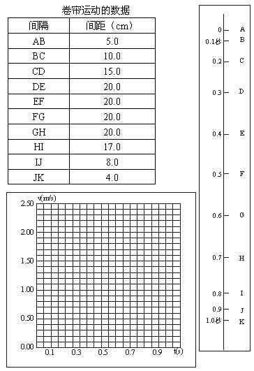 22、利用打点计时器研究一个约1.4 m高的商店卷帘窗的运动.将纸带粘在卷帘底部,纸带通过打点计时器随帘在竖直面内向上运动.打印后的纸带如图所示,数据如表格所示.纸带中AB、BC、CD……每两点之间的时间间隔为0.10 s,根据各间距的长度,可计算出卷帘窗在各间距内的平均速度v平均,可以将v平均近似地作为该间距中间时刻的即时速度v.