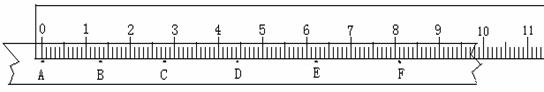 (2)某同学拖动纸带运动,打点计时器在纸带上打出一系列点,电源的频率是50Hz,处理时每隔1个点取一个记数点,标上字母A、B、C、D、E、F,A点与0刻度对齐。
