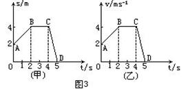 图3是甲、乙两物体的位移和速度图象.试根据图象简单说明从A→B→C→D的各段时间内甲、乙运动情况,并得出甲、乙两物体在5s内的位移各是多少?