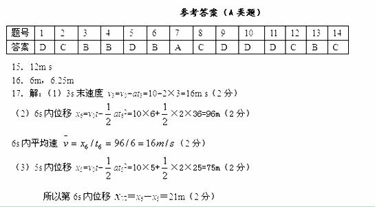 16.(6分)汽车以5 m/s的速度在水平路面上匀速前进,紧急制动时以-2 m/s2的加速度在粗糙水平面上滑行,则在制动后2s末的速度 m/s 和4 s内汽车通过的路程分别为 m。