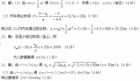 19.(10分)一辆汽车在平直公路上匀速行驶,速度大小为v0=5m/s,关闭油门后汽车的加速度为a=-0.4m/s2。求: