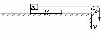 16. (12分)如图所示,一块质量为M的匀质板放在足够长的光滑水平桌面上,初始时速度为零. 板的左端有一个质量为m的物块,物块与板间的动摩擦因数为μ,物块上连接一根足够长的细绳,细绳跨过位于桌面边缘的定滑轮,某人以恒定速度v向下匀速拉绳,绳子对物块的拉力保持水平,物块最多只能向右到达板的中点,且此时板的右端尚未到达桌边的定滑轮. 求: